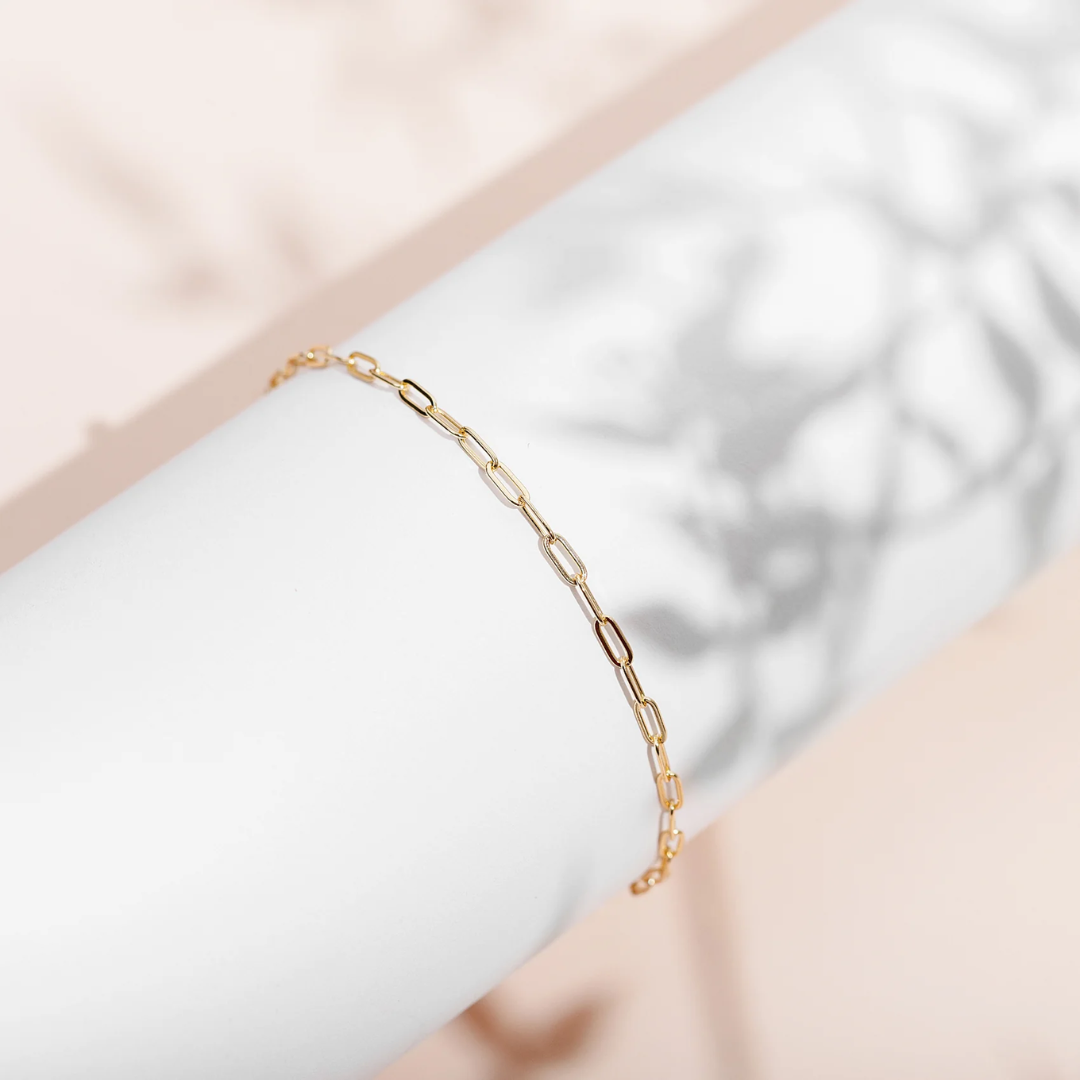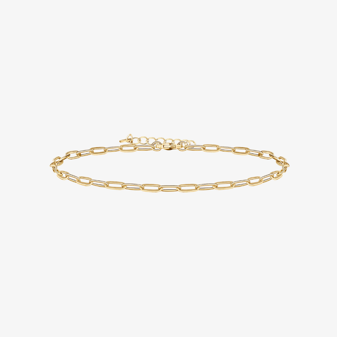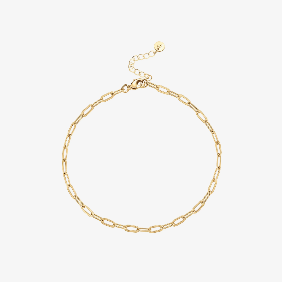 Add a touch of playful charm to your look with this Paperclip Chain Anklet. Its sleek, minimalist design makes it perfect for layering or wearing solo as a subtle statement. Whether paired with sneakers or sandals, this delicate anklet effortlessly elevates any casual outfit. A must-have for your jewelry collection!