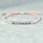 This elegant tube bracelet features the engraved mantra, "Don't let the hard days win," serving as a refined symbol of resilience and inner strength. Designed to inspire courage and determination, it offers a subtle yet powerful reminder to face challenges with grace. Whether gifted on meaningful occasions or worn daily, this bracelet embodies a steadfast belief in overcoming adversity and embracing perseverance. Let it be your constant companion in moments of struggle, encouraging you to rise above and declare your unwavering resolve.