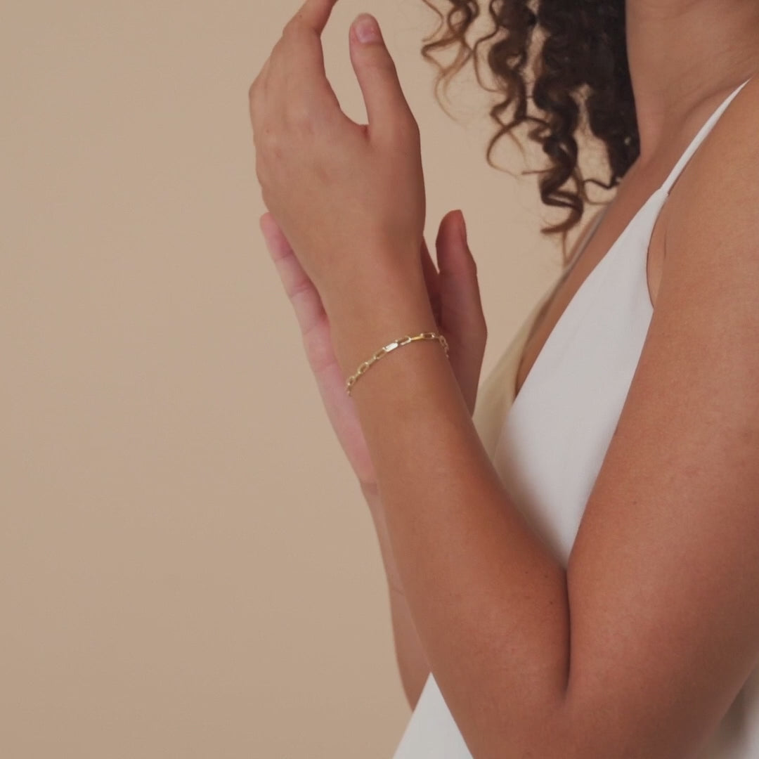 Elevate your style with this 14k gold-plated Paperclip Chain Bracelet. Its sleek, minimalist design makes it an elegant standalone piece or a refined addition to layered looks. Crafted for subtle sophistication, this bracelet adds a touch of modern grace to any ensemble.