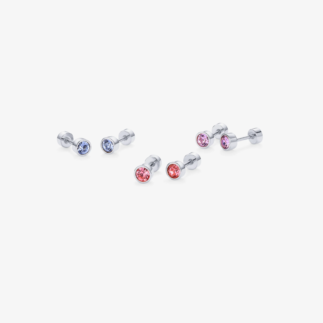 Indulge in everyday glam with our Colorful Flatback Earrings. These exquisite earrings feature a 4.3mm diameter and sparkling 3.5mm stones in Light Rose Quartz, Light Blue Sapphire, and Violet CZ. Add a touch of elegance to any outfit with these dazzling earrings.