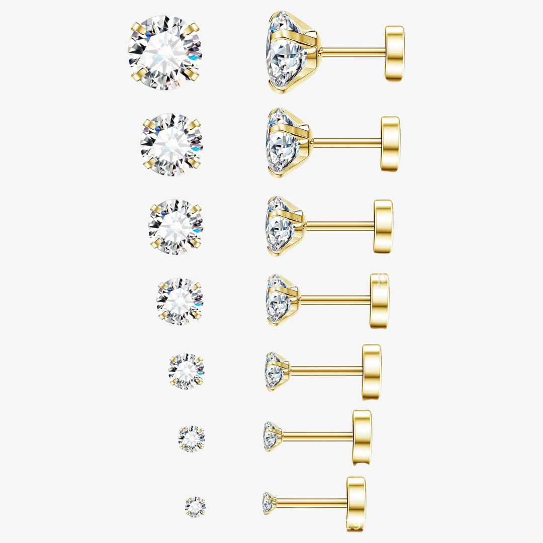 Elevate your elegance with this set of seven pairs of cubic zirconia flat back studs. Designed for versatility, each pair offers a subtle sparkle that complements any look, day or night. Their flat back ensures comfortable wear, making them an ideal choice for both style and ease. Perfect for layering or gifting, these studs bring timeless sophistication to your jewelry collection.