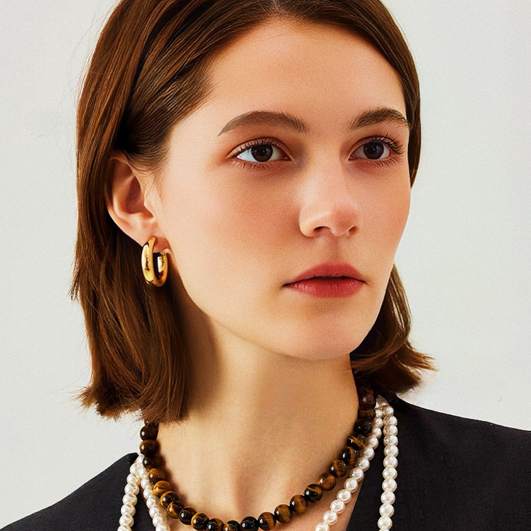 Our jewelry is made from high-quality stainless steel and finished with a luxurious layer of 14k or 18k gold or silver. This durable material resists tarnishing and fading, offering greater longevity than traditional gold, silver, or even platinum. It won’t discolor your skin and retains its brilliant shine over time.