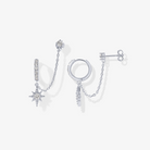 The Starlight Chained Huggie Earrings feature an 8mm diameter CZ huggie paired with an 11.5mm by 9mm dangling star charm, connected by a delicate 30mm chain. Complemented by a 3mm CZ stud, this set is designed for women with multiple piercings, offering a refined and elegant look. Crafted with premium AAAAA cubic zirconia, these earrings add a sophisticated sparkle to any ensemble.
