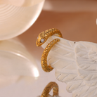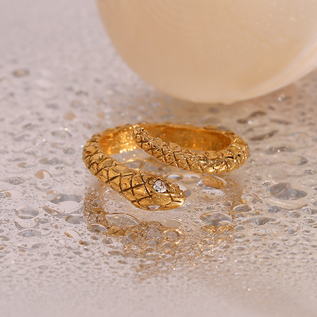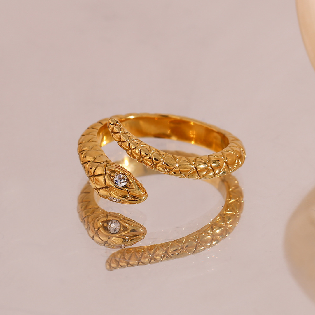 Enhance your look with the Crystal Eye Snake Ring. This adjustable ring showcases a snake design with sparkling crystal zirconia eyes, exuding a refined and striking charm. Wear this distinctive accessory to bring a subtle elegance and captivating allure to your ensemble.