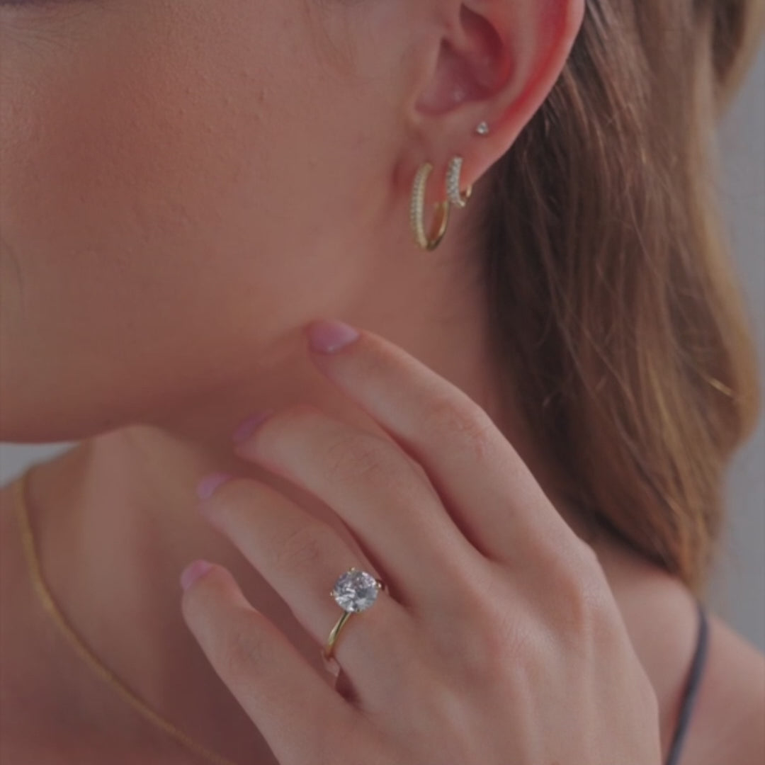 This Round Solitaire Engagement Ring embodies timeless elegance. Its 3CT round cubic zirconia and sleek 14K gold-plated band make a statement as a promise ring or stylish stand-in. Effortlessly elevate any look with this versatile, sophisticated piece. Perfect for saying "yes," or as a travel ring.