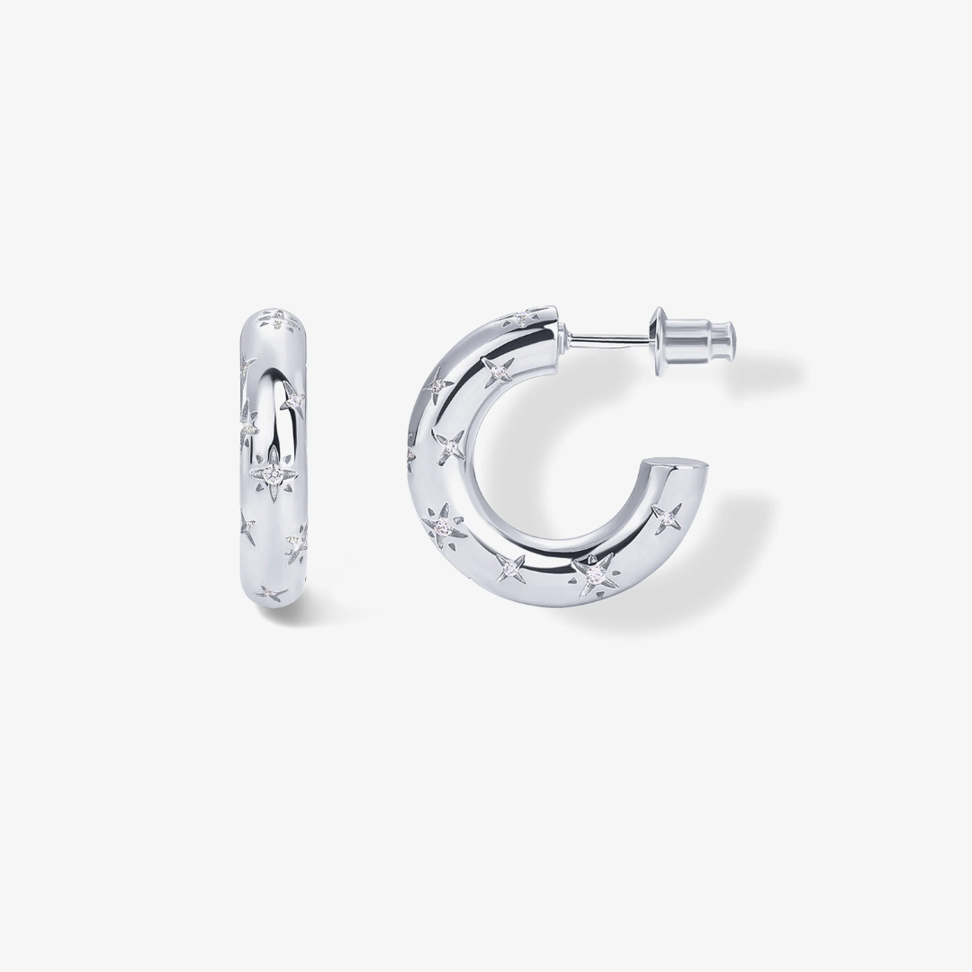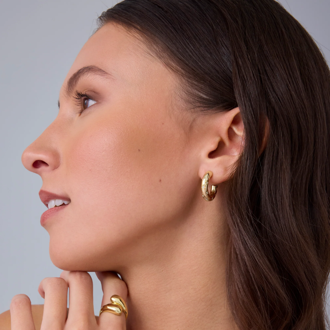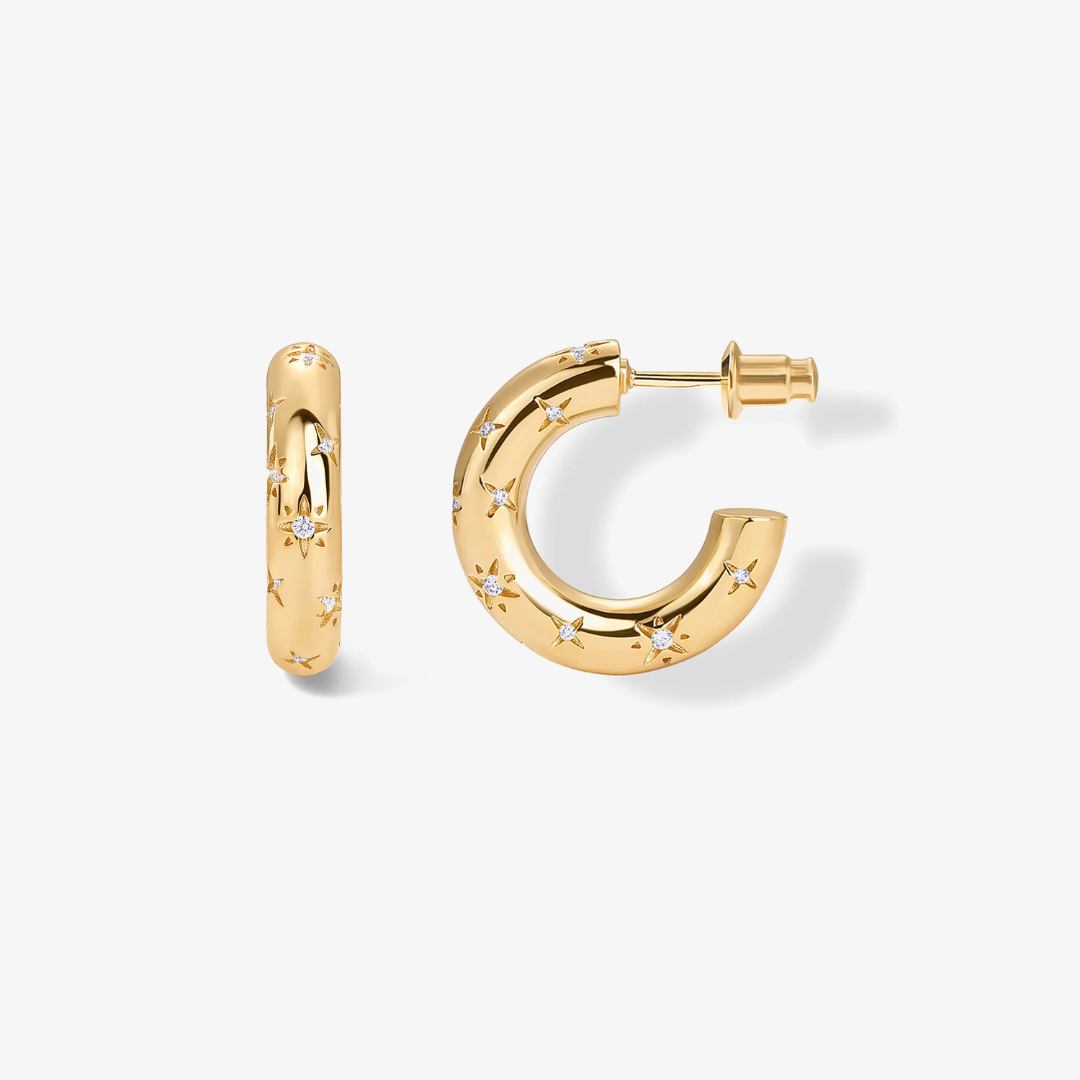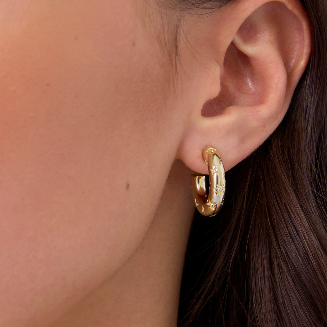 Dance among the stars with our Cosmic Hoops! These cheeky little huggies feature fun star engravings and twinkling crystals that'll make your ears the life of the party. Mix and match them in your ear stack or let them shine solo—either way, they're ready for adventure! These cosmic cuties are your ticket to a playful galaxy of style that's light-years ahead of boring accessories.
