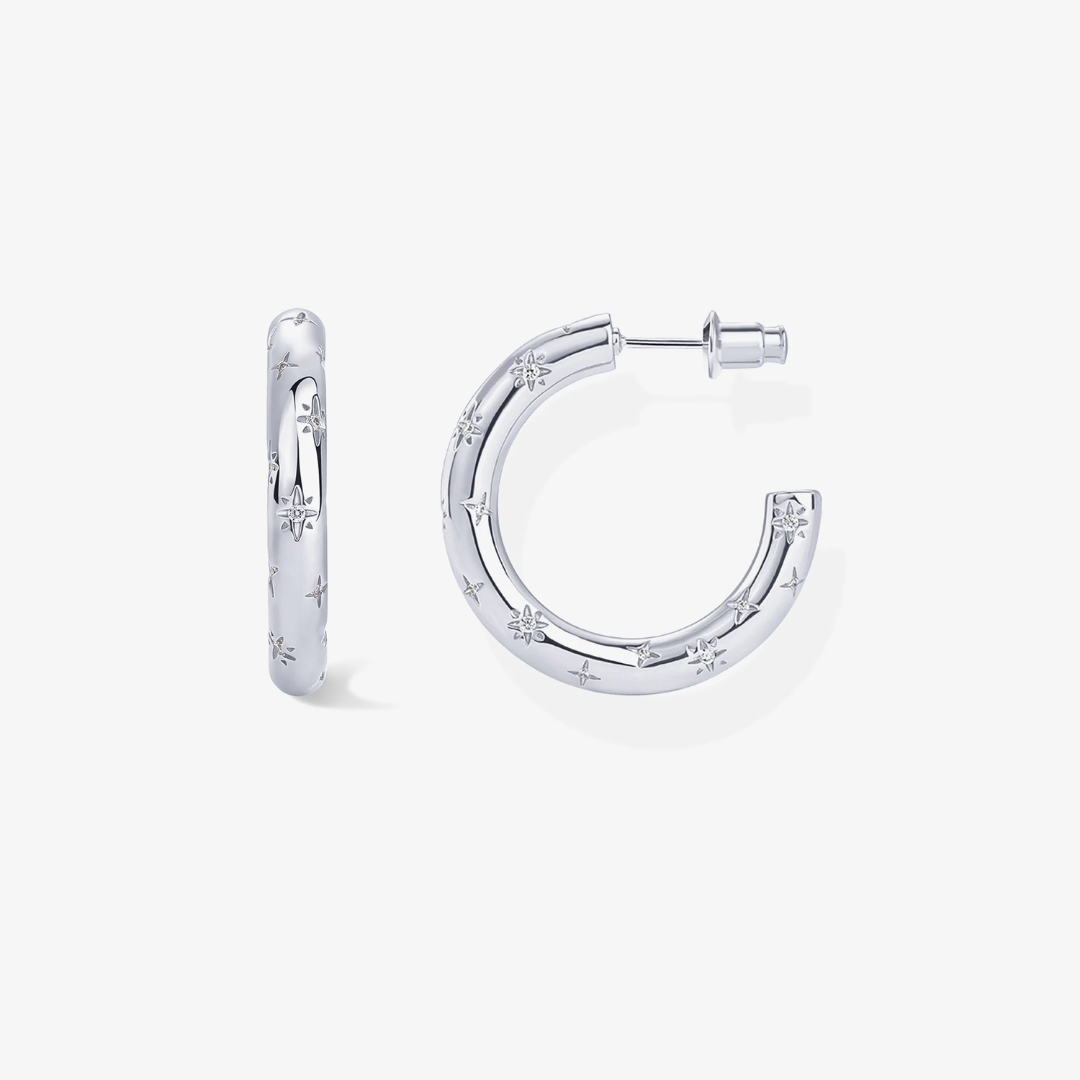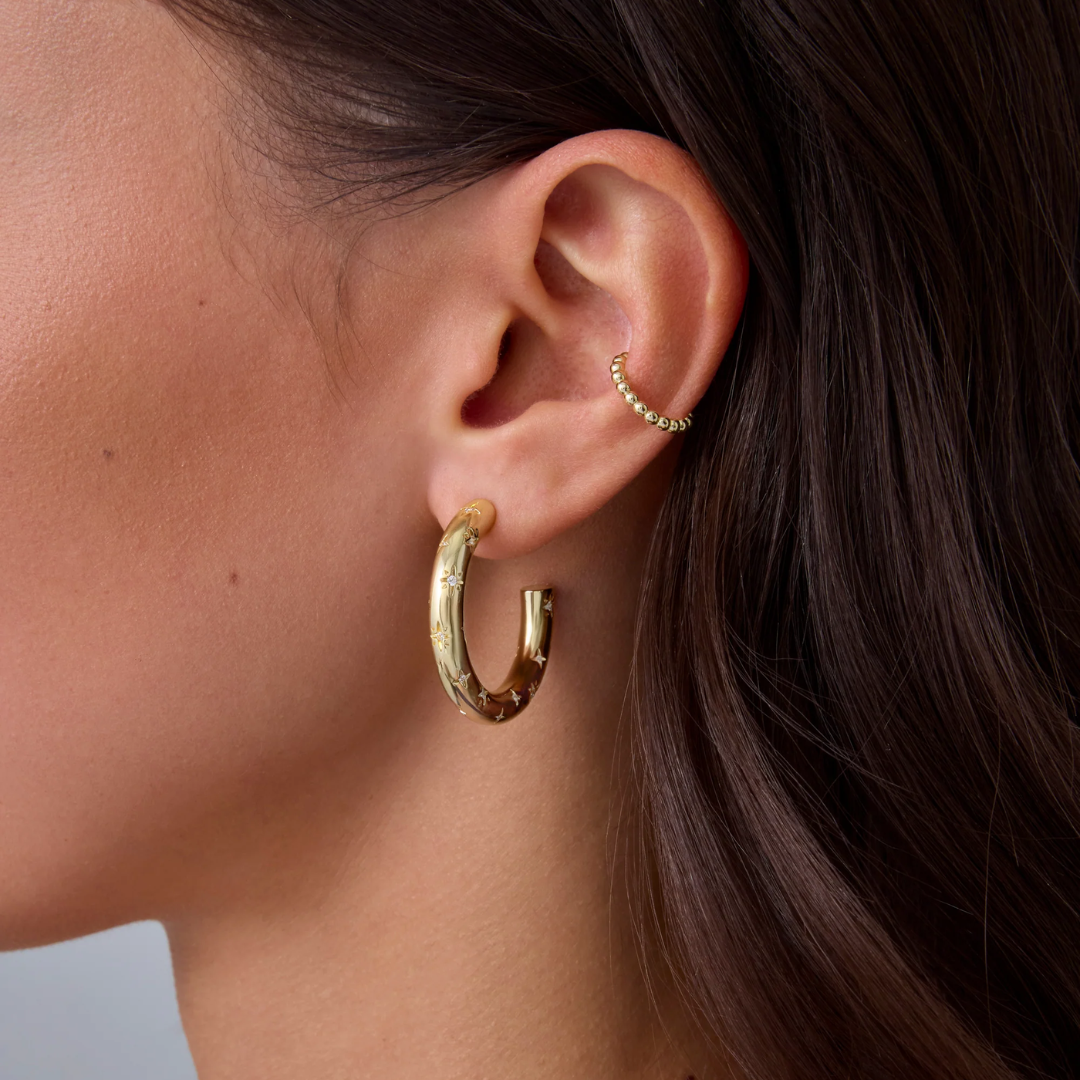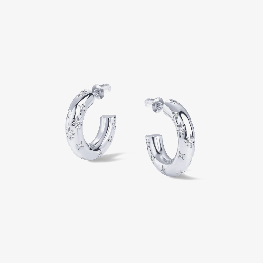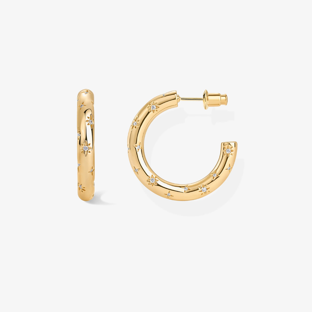 Dance among the stars with our Cosmic Hoops! These cheeky little huggies feature fun star engravings and twinkling crystals that'll make your ears the life of the party. Mix and match them in your ear stack or let them shine solo—either way, they're ready for adventure! These cosmic cuties are your ticket to a playful galaxy of style that's light-years ahead of boring accessories.