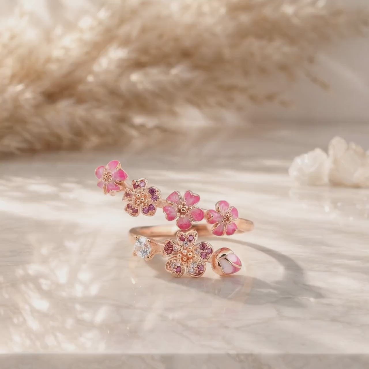 Pink Peach Blossom Flower Branch Open Ring