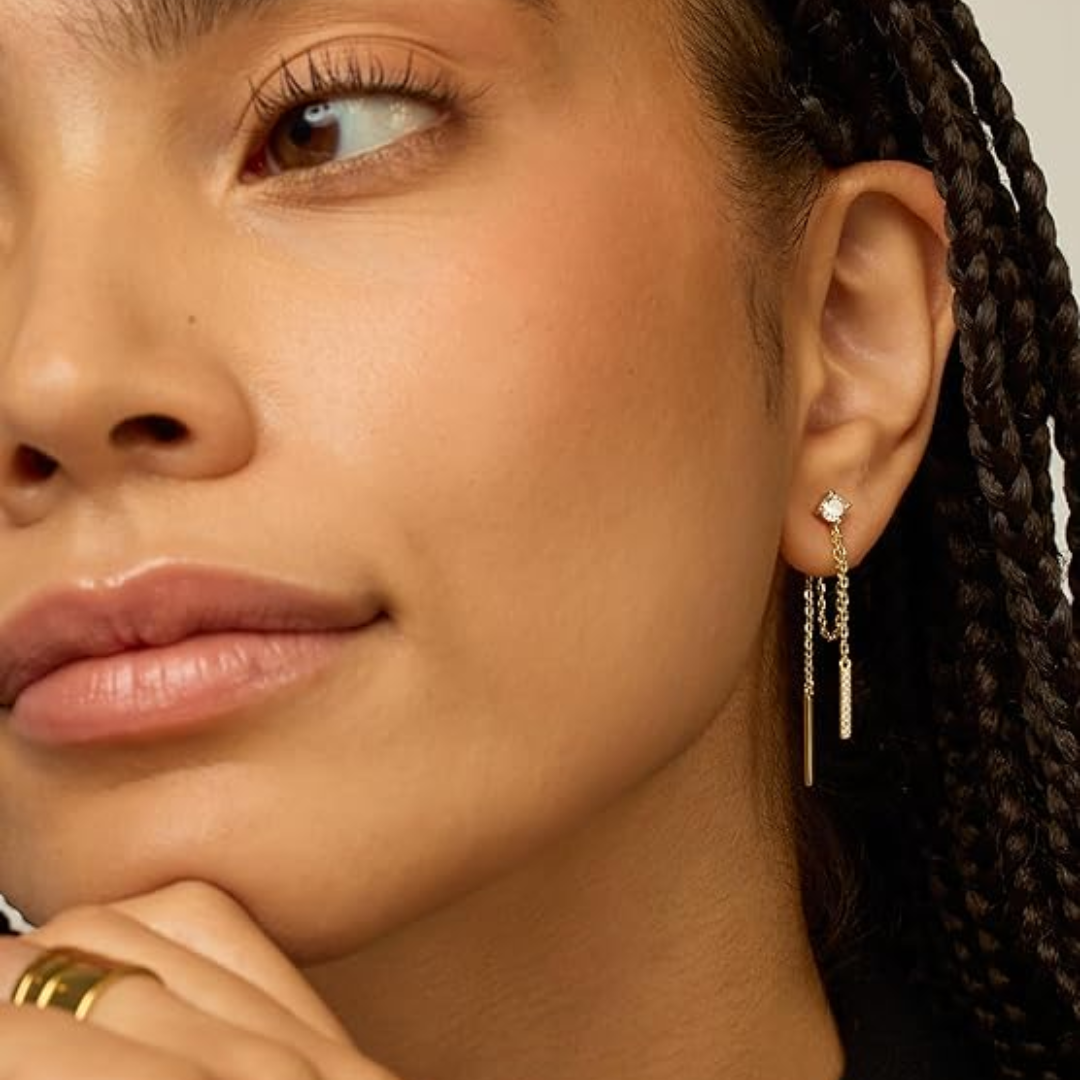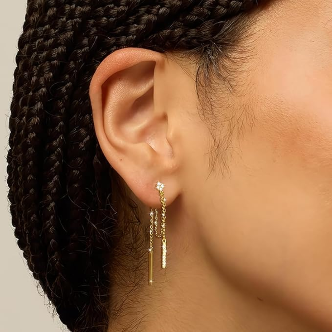 Defy conventional elegance with our Mini Cubic Zirconia Chained Bar Earrings. These rebellious 18k gold-plated stunners showcase a fearless 4mm cubic zirconia that refuses to be overlooked. The provocative combination of a bold back chain and its daring front counterpart creates an unapologetically eye-catching statement. Not for the timid—these earrings are for those who dare to stand out in any crowd.