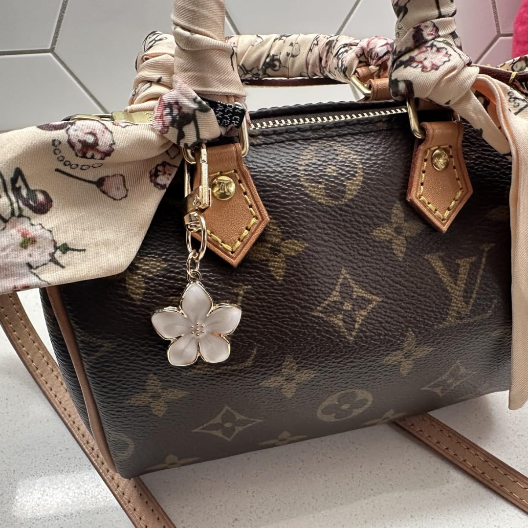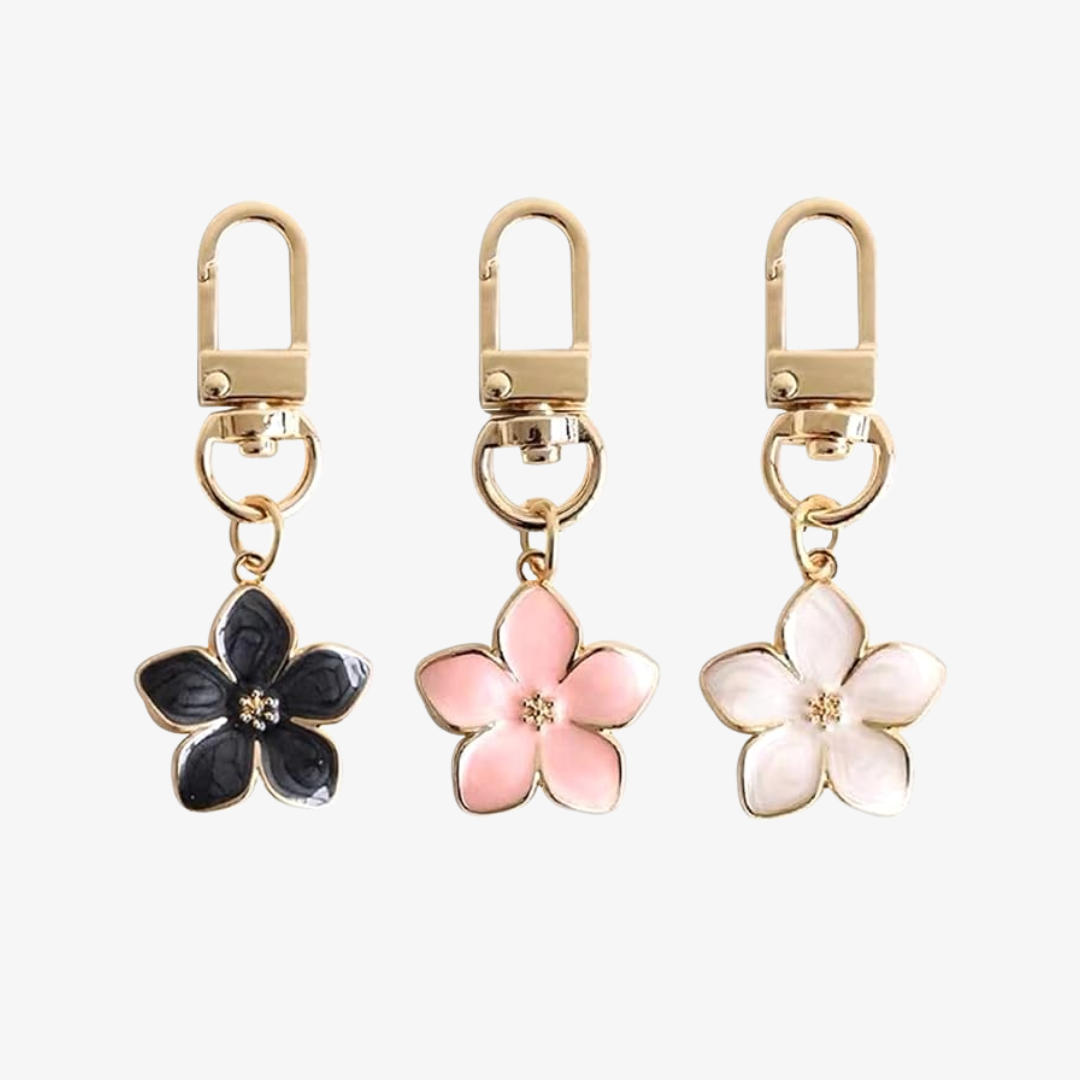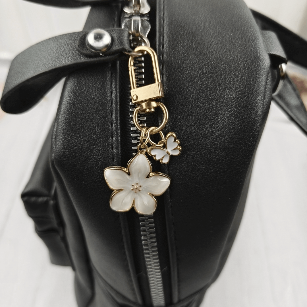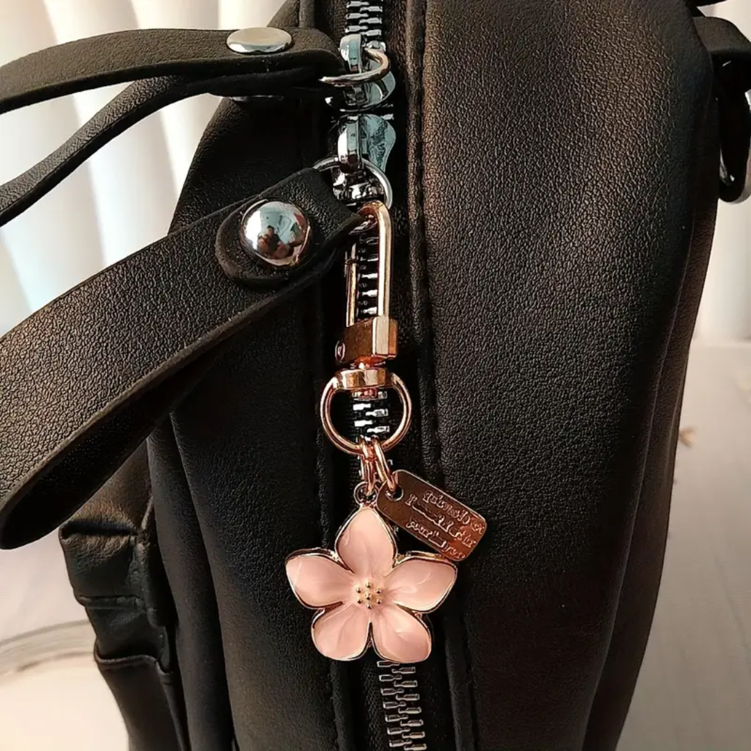 The Sakura Flower Bag Charm is a stylish accessory made from quality alloy with a gold finish and subtle color accents. It clips easily to bags or keys, adding elegance while keeping your essentials organized. Perfect for both special events and daily use.