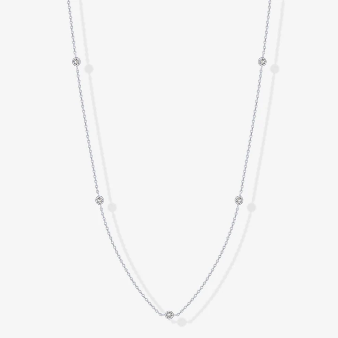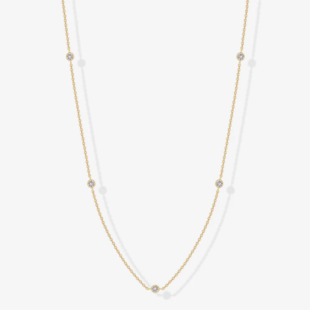 This station necklace is the epitome of luxury. Crafted with high-quality cubic zirconia's elegantly bezel set in five stations on a 14K gold-plated cable chain, this necklace exudes sophistication. Its timeless design and versatility make it the perfect layering piece for any occasion. Elevate your style with this stunning simulated diamond by the yard necklace.